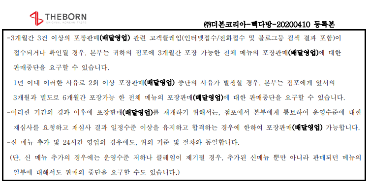 전체메뉴 포장판매(배달영업) 판매중단요구할 수 있다고 함