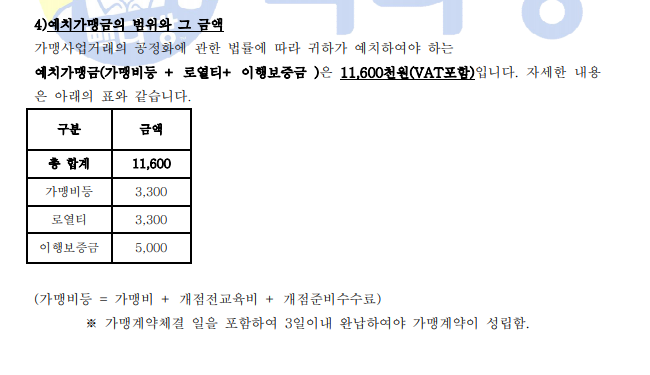 예치 가맹금 1160만원 + 7275만원 = 8435만원 (부가세포함)
