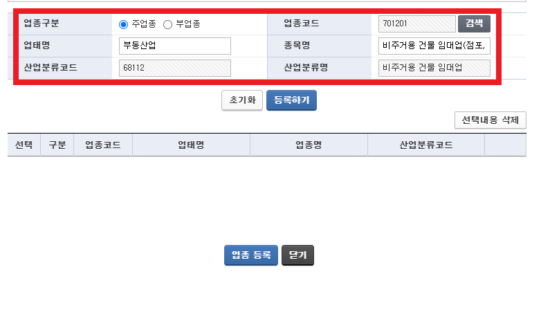 업종 입력/수정 들어가서 검색 !