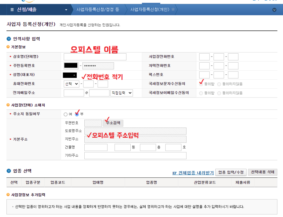 ※오피스텔 주소검색해서 안나오면 사업장 소재지가 건물신고 안된~ 이부분체크하고 하단에 기재하면 되요.